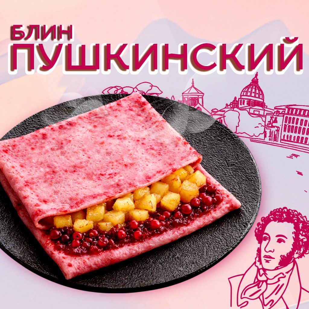 С 21 апреля в ресторанах сети появился розовый блин, вдохновлённый петербургской атмосферой и историей Арины Родионовны — няни Александр Пушкин.